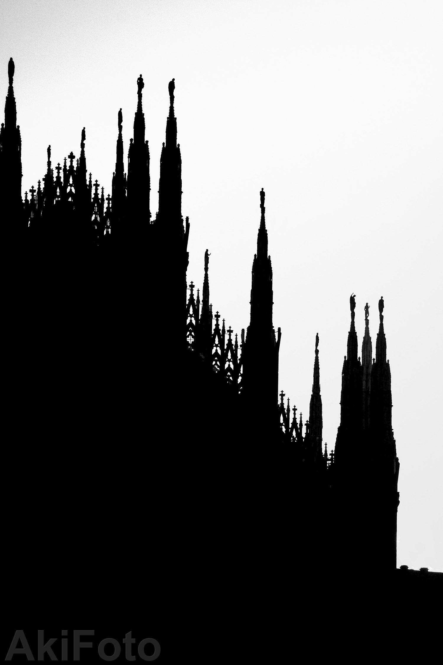 ミラノのドウオーモ。名所中の名所なので今までに無さそうなショットを撮るのはとても難しい。どうしたものかと考えた末、こんなシルエットだけの写真になった。絵葉書によくあるようなディテールがピタッと決まっているのとは全く別物だけれども、ここへ行ったことのある方ならば、これだけでも、即ミラノのドウオーモとわかる。B&Wのシルエットにしたことによって幻想感が強くでた、会心のアートといえる仕上がりになった。これを飾るだけで、イメージが一新されるはず。